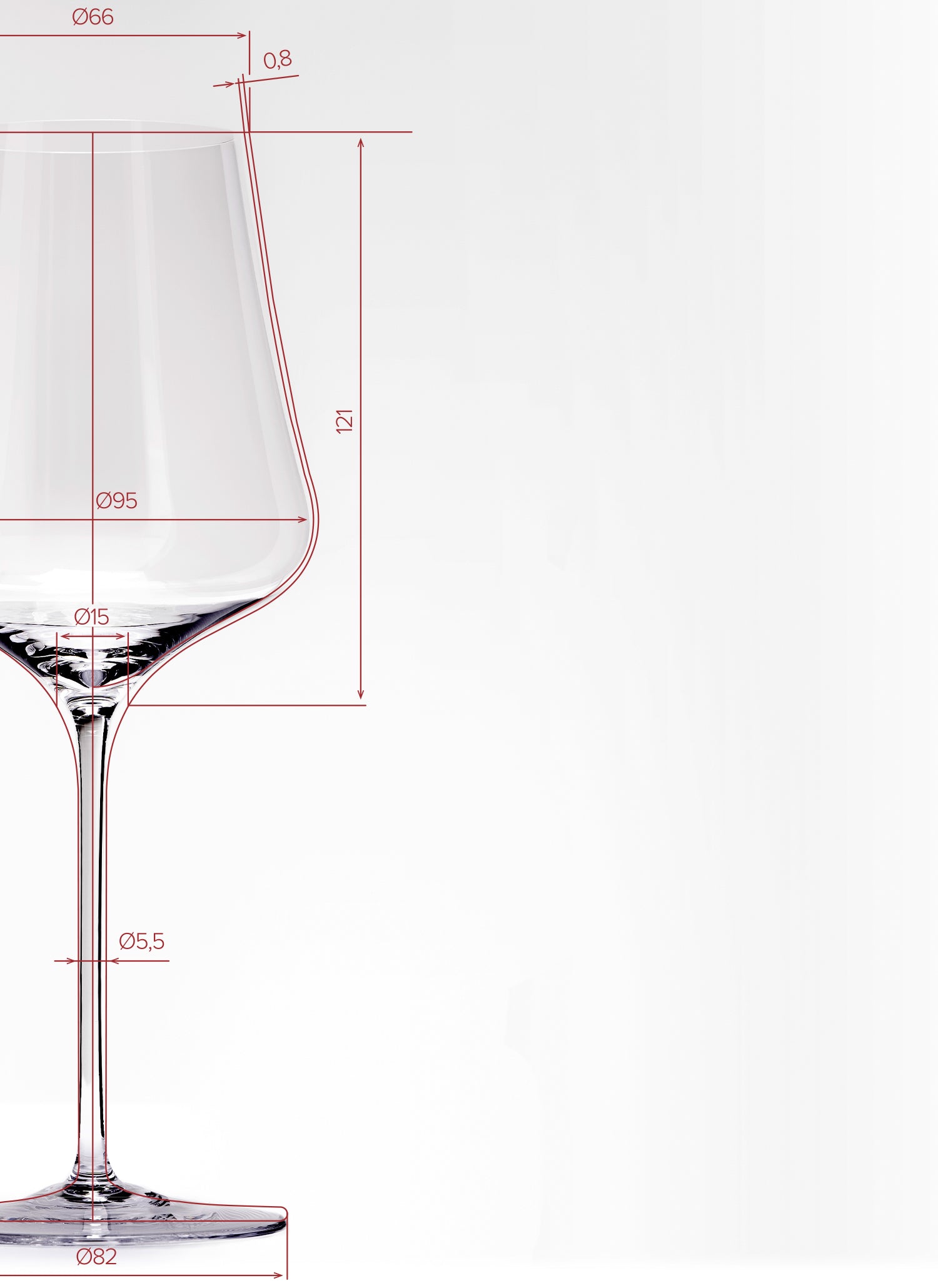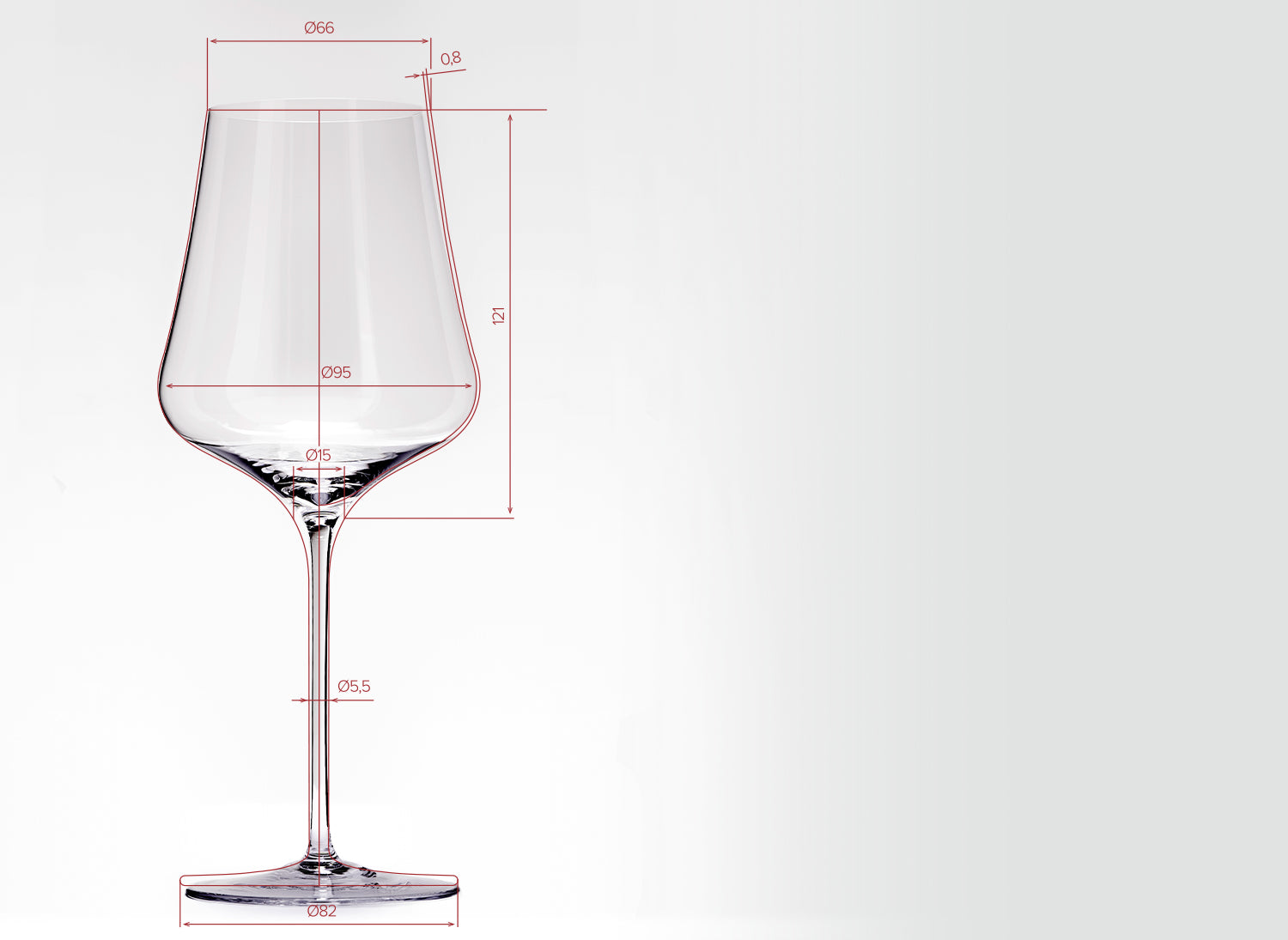 The broader diameter at the base of the bowl and the gentle conical shape is purposefully designed to open the wine’s aromas and drive the bouquet.